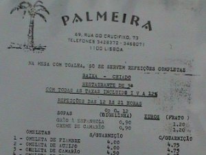 U ulici Rua do Crudifixo na broju 72 smjestio se rastoran Palmeira. Prvi dodir s restoranom je jelovnik koji je tiskan na starom pisačem stroju. |