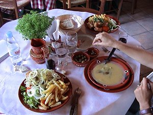 Glavno jelo je bio Bacalhau a lagereiro, neka vrsta pohanog bakalara pečenog u pećnici. Naravno radilo se o usoljenom bakalaru kojemu je odstranjena sol. recept Porcije su opet bile obilne. Cijeli ovaj ručak uz litru (odličnog) vina kuće i catu (melon) za desert, koštao je za dvoje 100-ak kuna. |