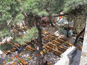 | Castelo je stara tvrđava koja gleda na centar Lisabona. Pretvorena je u jedno veliko zabavište i restoran. Drveni stolovi u sredini, |