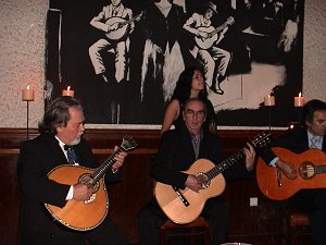 Fado svirači. Lijevo je instrument koji se zove "guitarra" koji daje boju zvuka fadu. Ima 8, 10 ili 12 žica. |