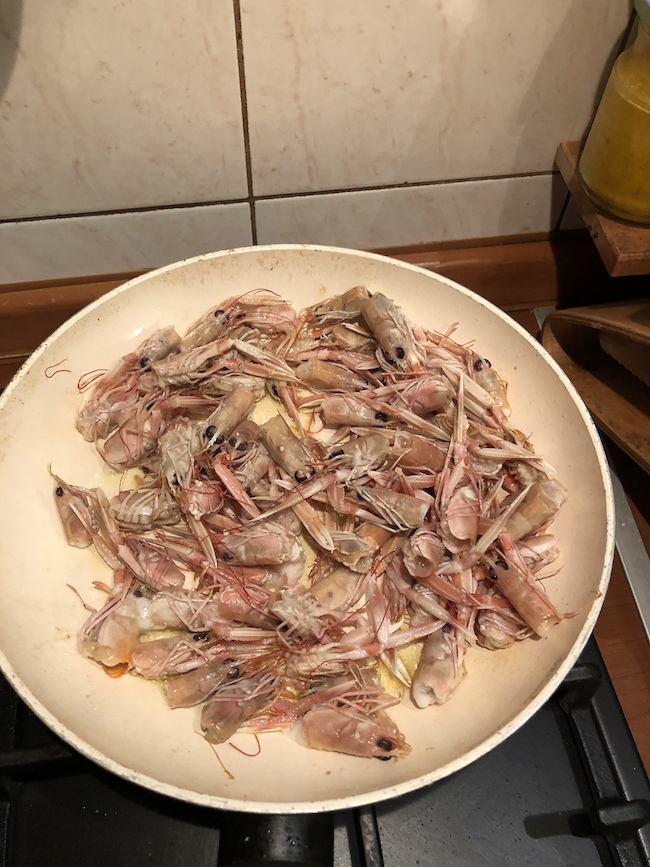 U posebnoj tavi se lagano na samom maslinovom ulju zaprže očišćeni repovi kozica i čekaju svoje sljubljivanje s rižom.
