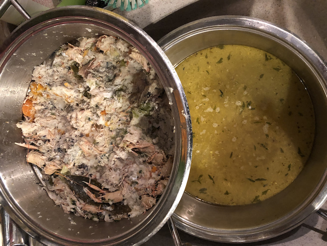 Nakon kuhanja od otprilike 30-ak minuta sva riba i glave škampi su procjeđene i dobro istisnute,