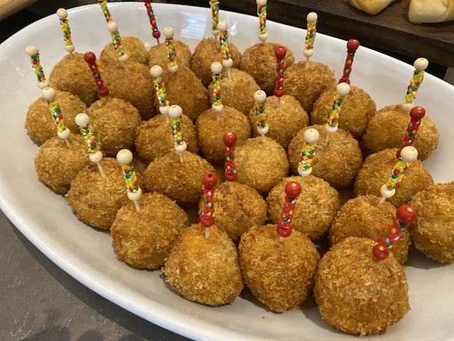 Paella arancini sa kozicama, višnjom i majonezom od vlasca.