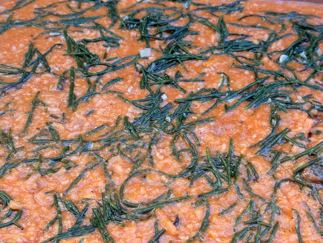 Rižot „Vrhovi dubina“ s algama, morskim šparogama i plodovima mora.