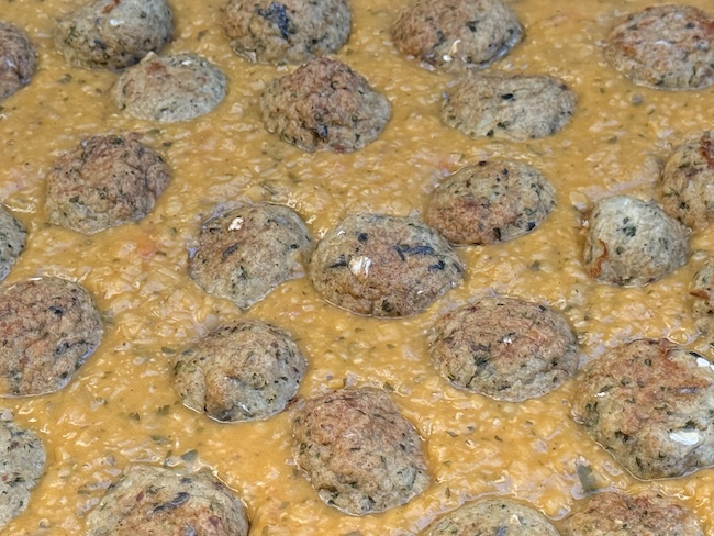 Okruglice od bijele ribe i morskih algi s crvenom lećom.