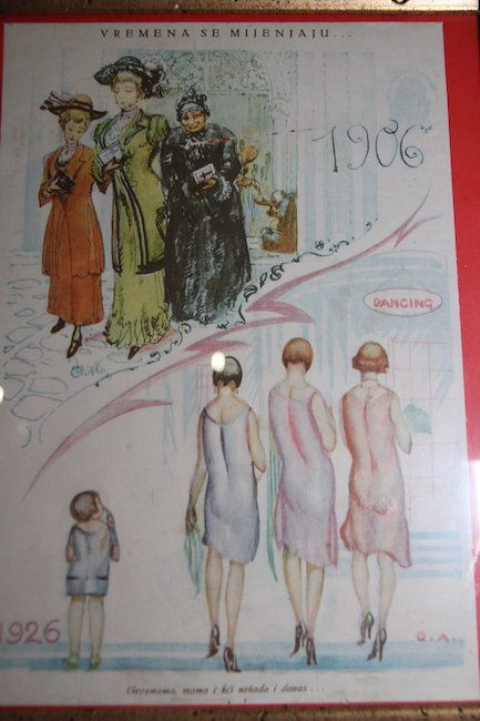 Eksponata je svakakvih. Pažnju nam je privukao crtež ''Vremena se mijenjaju''. Izgleda da se najveća promjena, bar što se tiče ženske mode, dogodila između 1906. i 1926.