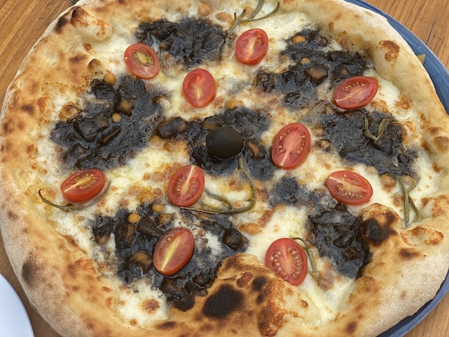 Pizza Crna Kraljica biogradskog mora (mozzarella, sipa kuhana u prošeku i crnilu, slanutak, cherry rajčica).