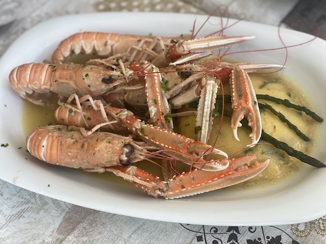 Škampi s polentom, pripremljeni s vrbničkom žlahtinom, maslinovim uljem i začinima, posluženi uz polentu s divljim šparogama.