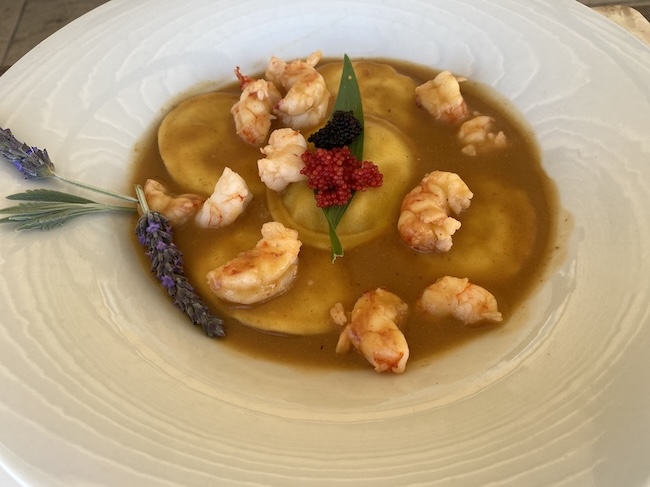 Ravioli punjeni capesantama i kozicama, posluženi u nježnom umaku od rakova s dodatkom crnog i crvenog kavijara, spajaju bogate morske okuse.