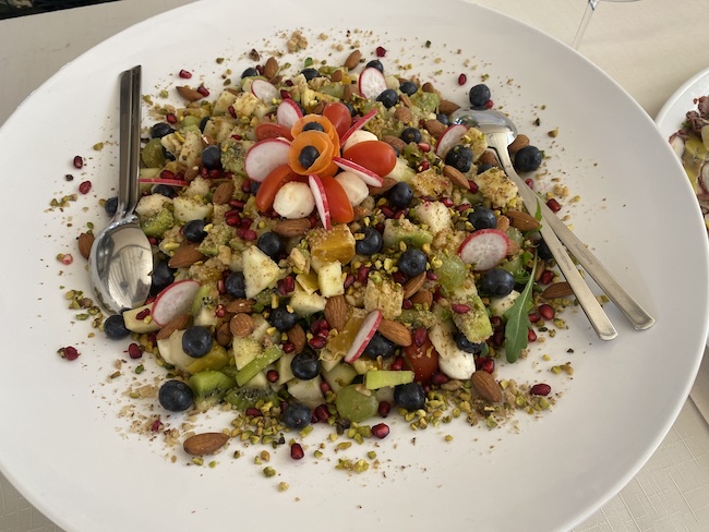 Salata od voća, povrća i lošinjskog koštunjavog voća - Osvježavajuća kombinacija lisnate salate, rotkvica, cherry rajčica, mozzarelle, oraha, badema, mandarina, zelene jabuke, kivija, borovnica i malina, začinjena mješavinom maslinovog ulja, limuna i svježeg bosiljka.