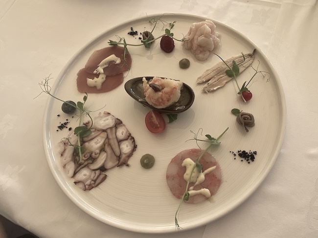 Paleta morskih delicija i tekstura - Raskošno jelo od tanko narezane carpaccio tune, škampa i inćuna mariniranih u limunovom soku i domaćem jabučnom octu; hladne hobotnice narezane na tanke ploške te kozica u sauru.
