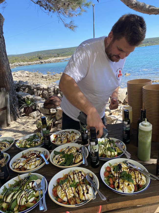 Burratu s avokadom s lošinjskim biljem i cvijetom bosiljka; Burratu s breskovom, lošinjskim medom i mentom i Trganu creska janjetina u tacosu. Gastronomsku ponudu su pratila vina vinarije Sosich iz Vižinade.