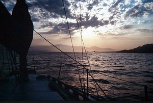 U velikom, bučnom PATRASU obnova zaliha i ujutro - eto me opet na pučini, divno jedreći pod promjenjivim vjetrovima! Od ogromnog, novog driftera do malog floka - taj dan sam se zaista namijenjao jedara! Zaista uživajući, u predvečerje tog iznimno uspješnog jedriličarskog dana ujedrio sam u zaljev obalnog ribarsko-turističkog mjesta ASTAKOS: na rivi poredane čarterske jahte, svi gledaju večernju predstavu "PRISTAJANJE". Kad tamo, neki neobrijani, pougljenjeni, odrpani i smežurani starčić (ja osobno), poskakujući na tanašnim bosim nožicama po isto tako odrpanoj jedrilici, pokvario im je uobičajeni scenarij, uništio predstavu "pristajanje", najljepšu večernju razonodu svih čarterskih luka! Odabrao sam mjesto pristajanja, napravio mali krug, spustio jedra, spustio sidro po krmi, prišao obali, izbacio "cime", iskočio, privezao, uskočio natrag na brod, pritegao sidrenjak, navukao tenisice i - odjezdio u potrazi za gyrosom i hladnim Amstelom... Sve je bilo gotovo za manje od minute, izostao je klasični višekratni "bis", nije bilo "talijanske opere" (Talijani su najbrojniji i najlošiji nautičari ove regije...) Dan kasnije vec sam u LEVKASU, zatim PAXOSU i na koncu KRFU. Čitaoce neću daviti ovom rutom: imali su je prilike upoznati na početku ovog serijala. Na Krfu ću docekati prijatelja STIPU TOMIĆA, začetnika cijele ove ideje jedrenja do Grčke, koji će za koji dan sletjeti avionom ljubljanskog Adria Airwaisa. Pratite nas redovito !