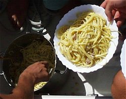 Zažutiti na bijelom ulju sjeckani crveni luk. Dodati očišćenu mrkvu izrezanu na kockice, a nakon toga dimljenu mesnu slaninu (pancetu). Kad je mrkva omekšala uliti vrhnje za kuhanje, a aki treba još i malo mlijeka i kesicu parmezana ( a može i crne masline). ne zaboraviti posoliti i popapriti.