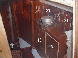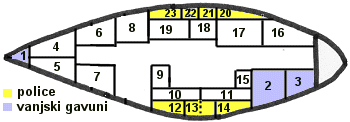 RASPORED NAMIRNICA PO GAVUNIMA NA BRODU UFO 27 (8,20 m) Napomena: U spremištima 1, 2, 4, 5, 6, 8, 11, 12, 15 i 17 ne nalazi se hrana već druga oprema, primjerice alat, rezervni djelovi, lijekovi, roba, sidro, jedra, rezervar vode i slično.  |
